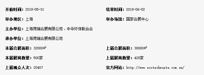 2018年第四屆上海國際固廢氣展將于2018年5月31日-6月2日在國家會(huì)展中心(上海)舉行,展覽面積將達(dá)到32,000平方米,來自全球的參展商將達(dá)到500+家,高效邀約優(yōu)質(zhì)參觀團(tuán)100+個(gè),專業(yè)觀眾35,000+位。