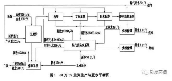 1.3蘭炭生產(chǎn)廢水:蘭炭生產(chǎn)屬于煤中溫干餾過程,干餾過程及煤氣凈化過程中形成的廢水稱為蘭炭生產(chǎn)廢水。蘭炭生產(chǎn)廢水是一種高COD、高酚類、高氨氮、難降解的有機(jī)廢水,與焦化廢水相比,蘭炭生產(chǎn)廢水COD要高10倍左右,酚類、氨氮的濃度也遠(yuǎn)高于焦化廢水。因此,蘭炭生產(chǎn)廢水更難于處理。60萬t/a蘭炭生產(chǎn)裝置水平衡圖如圖1所示。