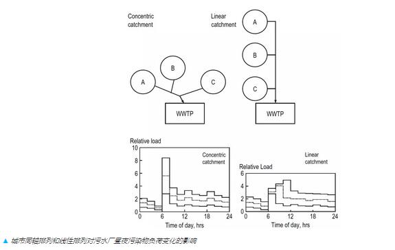 Gujer教授提醒我們污水處理系統(tǒng)除了污水處理廠之外,管網(wǎng)也是其重要的組成。污水廠的進(jìn)水負(fù)荷變化在某程度是由于污染物進(jìn)入管網(wǎng)時(shí)間的差異,以及管網(wǎng)分布的長度造成的,這兩個(gè)因素都跟時(shí)間這個(gè)變量有關(guān)。Gujer教授用下圖闡述了同軸排列和線性排列兩種排放模式的區(qū)別——前者的負(fù)荷變化更大,而后者的收集方式能使進(jìn)水水質(zhì)更穩(wěn)定。由于晝夜負(fù)荷變化很大程度上控制了生物處理過程中的硝化性能,所以使用后者的城市規(guī)劃模式對(duì)該地區(qū)的污水處理是有好處的。