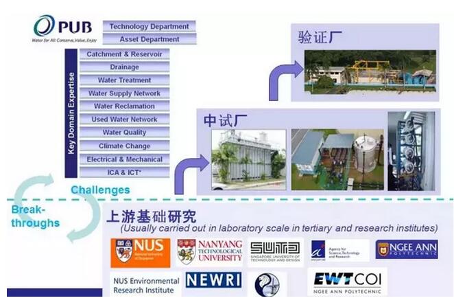 而如何將重大工程和科研投入,實(shí)實(shí)在在地轉(zhuǎn)為產(chǎn)業(yè)推動(dòng)力,新加坡的實(shí)證研發(fā)和示范研發(fā)機(jī)制功不可沒。水處理技術(shù)從實(shí)驗(yàn)室到中試再到生產(chǎn)規(guī)模使用,須經(jīng)歷一個(gè)長期過程,而新技術(shù)的應(yīng)用,獲得業(yè)主的信任和試用的成本也很高,這也是水處理技術(shù)推廣難和推廣慢的問題所在。