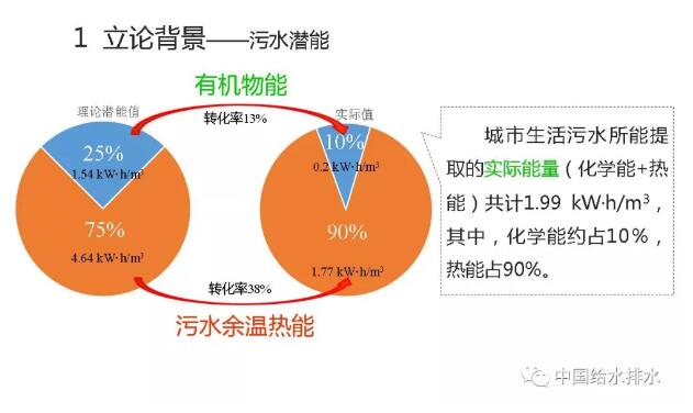 今天我的發(fā)言既與碳中和有關(guān)也跟磷回收有關(guān)。那么,關(guān)于碳中和談得是污水處理的耗能過程,有機物及氮磷去除要消耗能量,碳中和即需要從污水處理廠或污水里找到能量去彌補能耗。對此,大家更多會想到剩余污泥里有大量含能有機物,這也是我們搞污水處理人所關(guān)注的,所以,污泥厭氧消化從傳統(tǒng)到現(xiàn)在,以至于有更多的人前赴后繼對厭氧消化進行優(yōu)化提高其能量轉(zhuǎn)化效率,包括前處理,比如說,高碑店現(xiàn)在的熱水解,就是希望最大化把污泥中的有機能源轉(zhuǎn)化出來。但是,我們搞污水處理的人忽視了一個問題,就是說除了有機物形成的化學(xué)能以外,還有大量污水中的余溫?zé)崮?。請大家看這個圖,有機物中的化學(xué)能與污水中余溫?zé)崮芟啾?,很少、很少。理論上一個75%,一個25%。也就是說污泥中有機物的化學(xué)能只占整個污水中潛能的25%,75%是熱能。我們給大家先看這樣一個概念,也就是說我們所關(guān)注的厭氧消化轉(zhuǎn)化的能源占整個污水中的潛能,理論值是25%。那么這25%的有機能源又能轉(zhuǎn)化多少呢?顯然這是個理論值,不可能100%轉(zhuǎn)化。