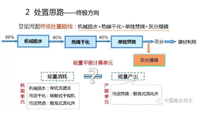 因此,最后只有去“燒”!但是,“燒”必須要經(jīng)過機械脫水,含水率99%的污泥首先降至80%;然后,再熱干化到40%以下。到40%就可以自持燃燒了。燒,但污泥焚燒千萬不能放在水泥窯中同水泥一塊燒。這樣不對。會把磷就全部固定在水泥里,磷再也不能回用了!所以,要單獨燒。最多可以跟有機垃圾一塊燒。燒完以后,大量的磷都在灰分里面,需要提取。當然了,大家知道,脫水、熱干化、單獨焚燒都是要輸入能量的,當焚燒之后也會產(chǎn)生能量?,F(xiàn)在我們有一個問題,就是輸入能量和產(chǎn)生的能量能否達到平衡?我們需要計算一下,如果能打個平手那就是很了不起的事了。