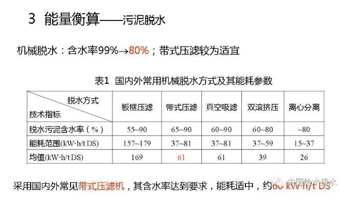 接下來我們看一下計算結(jié)果。大家知道,機械脫水有各種各樣的方法,99%~80%,這里列了很多技術(shù)與設(shè)備,我也不一一匯報了。常見的是帶式壓濾機,能達到80%含水率的要求,所以,我們就以帶式壓濾機為例進行計算,大概耗能折合成干固體每噸是60千瓦小時,即,60度電。熱干化,也就是從80%~40%,我知道搞干化設(shè)備的人有很多,到40%以后基本上就可以自持燃燒了。干化的時候輸入熱能進行蒸發(fā),所需熱量一個是用于污泥中水分升溫繼而蒸發(fā)的熱量,還有就是污泥升溫的熱量。