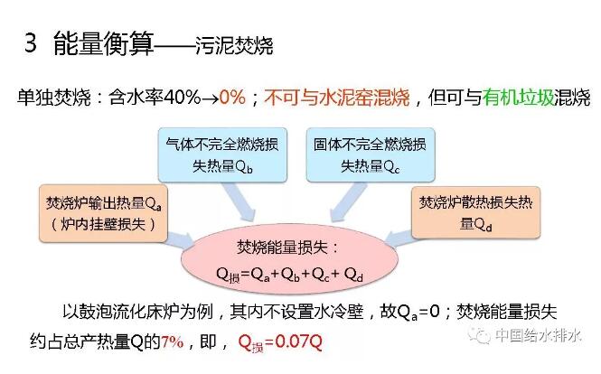 單獨焚燒,含水率40%~0%。不可與水泥窯混燒,但可與有機垃圾混燒。焚燒有熱量損失,焚燒爐輸出的熱量,比如說爐內(nèi)壁掛損失、焚燒爐散熱損失等等,所有損失加在一起,以鼓泡流化床為例,大概就是7%,即占焚燒產(chǎn)生熱量的7%,這都是有文獻可查的。污泥焚燒也產(chǎn)生熱量,這個熱量主要跟有機質(zhì)有關(guān),這個是計算公式。我們國家有機質(zhì)含量比較低,在30%~60%的范圍,我們計算時取污泥有機質(zhì)含量中間值53%,北京大概是60%。計算污泥燃燒熱為1.2GJ/kgDS。這是不同國家污泥燃燒值,中國大概在個范圍,平均是11850kJ/kgDS。我們的計算跟這個1.185GJ/kgDS基本接近,這都是從文獻來的數(shù)據(jù)。這樣經(jīng)過計算以后,污泥脫水+干化+焚燒,脫水要輸入能量,干化要輸入能量,焚燒產(chǎn)生能量;最后的結(jié)果會發(fā)現(xiàn)總耗能是3091度電每噸干固體??偖a(chǎn)能11.1GJ,利用熱電聯(lián)產(chǎn)轉(zhuǎn)換為電當量為2467度電。也就是說整個工藝的能量輸入為624度電。下面是詳細的計算表,不講了。
