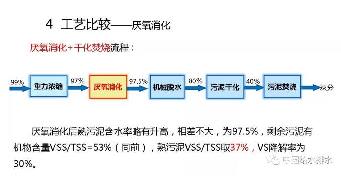 第二個比較就是跟傳統(tǒng)厭氧消化進行比較。傳統(tǒng)厭氧消化前面有重力濃縮,含水率99%~97%,然后厭氧消化,含水率再略微增加一點點。因為厭氧消化之后至少還有60%左右的有機物殘留,你還得脫水、干化。干化后污泥焚燒是跑不掉的。大家看一下,我們厭氧消化以后含水率按97.5%計,剩余污泥有機物含量是53%,熟污泥VSS/TSS是37%。