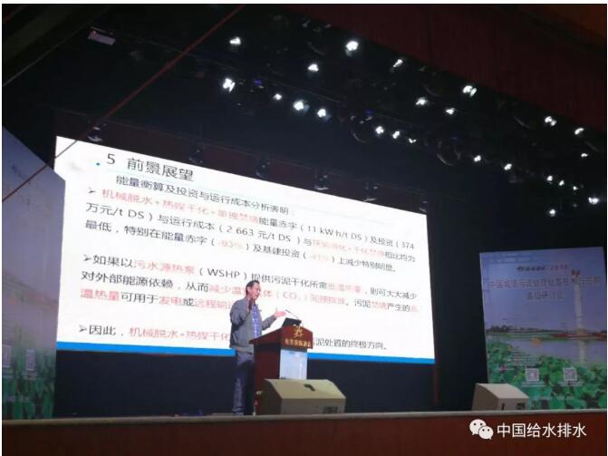 最后得到這樣一個結(jié)論,我們所推薦的工藝,機械脫水、熱媒干化、單獨焚燒,它在輸入能量節(jié)省、投資成本、運行費用方面都是最低的,特別是能量赤字可以減少27%,基建投資減少41%。這是大家最關(guān)心的,直接燒是不是成本高、能耗高?大家看看能耗還低了228度電。關(guān)鍵是能量輸入減少了27%,基建投資減少了41%。這個是非??捎^的。如果采用水源熱泵提供熱量,那么這個節(jié)省將更大,這個效益將是更加明顯?,F(xiàn)在主要是靠燒煤、燒油提供化石能量。前天早上我看到一個消息,美國紐約一個著名律師、生態(tài)活動家在紐約一公園焚燒自殺了,什么原因?他就是以他的死來抗議人類過多依賴使用化石燃料對生態(tài)造成嚴重破壞,以他的死來警告人類。所以我們在座的也應(yīng)該明白為什么。
