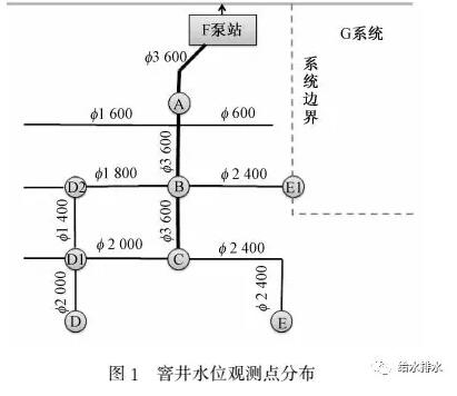 試驗(yàn)開(kāi)始前,對(duì)F調(diào)蓄池實(shí)施徹底清淤。每次試驗(yàn)時(shí),一般每隔24 h開(kāi)啟調(diào)蓄池,調(diào)蓄池蓄滿(mǎn)時(shí)間均在15 min左右。設(shè)計(jì)試驗(yàn)時(shí),在F泵站進(jìn)水總管、F系統(tǒng)邊界處,設(shè)置8個(gè)窨井水位觀測(cè)點(diǎn),分別為:位于總管上的A、B、C 3個(gè)點(diǎn);和B點(diǎn)直接相通的D2點(diǎn)、和B點(diǎn)直接相通且位于系統(tǒng)邊界處的E1點(diǎn);相對(duì)位于遠(yuǎn)端的、類(lèi)似于進(jìn)水管“肩膀”處的D、E、D1等3個(gè)點(diǎn),詳見(jiàn)圖1。