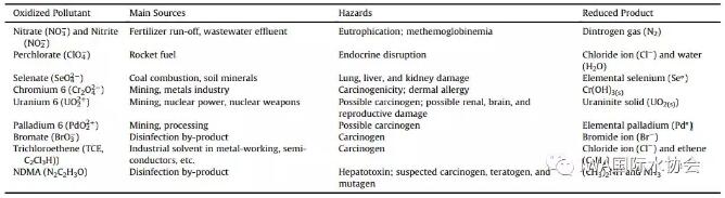 什么是氧化態(tài)污染物?它主要指一些無(wú)機(jī)含氧陰離子,但也包含外源替代性的有機(jī)物,包括硝酸鹽、高氯酸鹽、砷酸鹽、鉻酸鹽、氯化溶劑等。Rittmann教授對(duì)水污染中常見的氧化態(tài)污染物總結(jié)成下表: