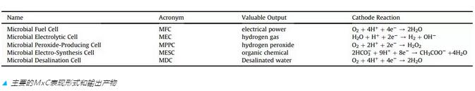 MxC是三個(gè)單詞的首字母縮寫,Rittmann教授在綜述中解釋了為什么他用其來(lái)稱呼微生物電化學(xué)電池。MxC包含了一套基于通用平臺(tái)的技術(shù)集合:其中C代表Cell,表示該系統(tǒng)是一個(gè)包含陽(yáng)極和陰極的電化學(xué)電池;M指微生物,而x表示這個(gè)平臺(tái)可以用不同的方式呈現(xiàn),對(duì)應(yīng)產(chǎn)生不同的產(chǎn)物,例如下表中的五種形式。另外MxC在其他文章的別稱可能包括生物電化學(xué)系統(tǒng)(BES),生物電化學(xué)技術(shù)(BET)和微生物電化學(xué)技術(shù)(MET)。