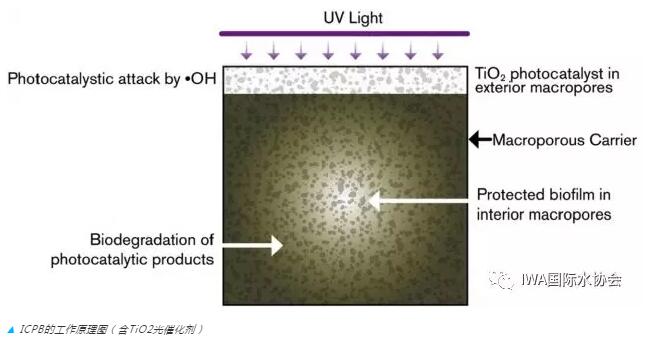 Rittmann教授介紹的第三個(gè)例子是光催化耦合微生物同步降解污染物(ICPB-intimately coupled photobiocatalysis)。顧名思義,利用光催化來(lái)實(shí)現(xiàn)頑固有機(jī)污染物的生物降解。ICPB系統(tǒng)主要由多孔載體、光催化材料及生物膜構(gòu)成。其主要工作原理是通過(guò)光激發(fā)載體上的光催化材料,將水體中難生物降解的污染物轉(zhuǎn)化為剛好可生物降解的物質(zhì),同時(shí)在載體內(nèi)部微生物的代謝作用下,將這些污染物的中間產(chǎn)物快速降解。外部容納光催化劑的大孔基底主動(dòng)地提供供體底物,并保護(hù)內(nèi)部的生物膜,免受紫外光和自由基的影響。