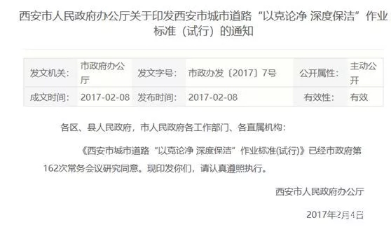 2017年2月8日,西安市政府辦公廳發(fā)布《西安市城市道路“以克論凈 深度保潔”作業(yè)標準(試行)》(下稱《標準》),對城市道路清掃保潔作業(yè)標準進行了明確規(guī)定。該《標準》將西安市道路清掃保潔等級劃分為重點區(qū)域、一級、二級、三級道路,并要求每平方米灰塵分別不超過5克、10克、15克和20克。