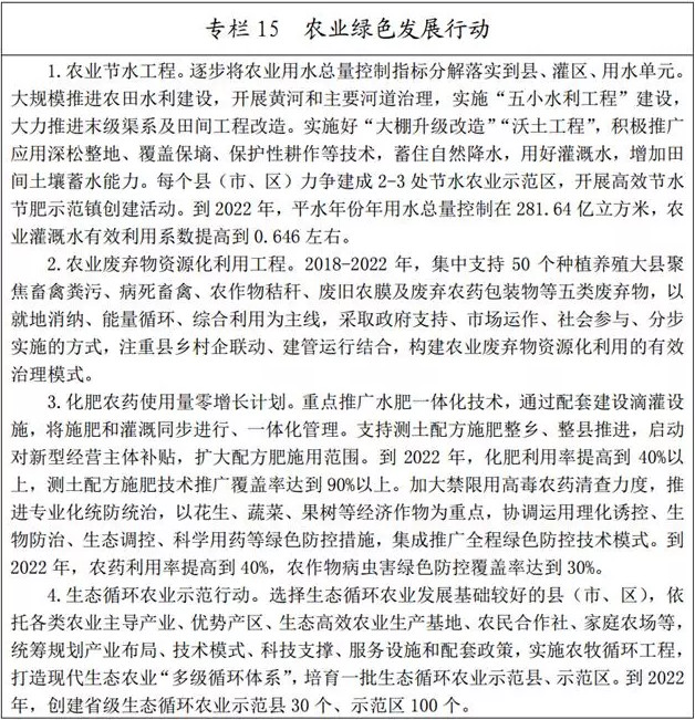 (二)推進農(nóng)業(yè)清潔生產(chǎn)。實施化肥、農(nóng)藥減量增效行動,全面推廣測土配方施肥技術,強化化肥、農(nóng)藥、獸藥、飼料添加劑等投入品使用管理,推進病蟲害統(tǒng)防統(tǒng)治和綠色防控。大力實施種養(yǎng)業(yè)循環(huán)一體化工程,加快規(guī)?;笄蒺B(yǎng)殖場區(qū)糞污處理設施建設與標準化改造,推動規(guī)?;笮驼託饨ㄔO,散養(yǎng)密集區(qū)逐步實現(xiàn)畜禽糞便污水分戶收集、集中處理利用,開展有機肥替代化肥試點。到2022年全省畜禽糞污綜合利用率達到81%,規(guī)模養(yǎng)殖場糞污處理設施裝備配套率達到100%。以縣為單位推進農(nóng)業(yè)廢棄物資源化利用試點,推廣秸稈高效利用模式,到2022年全省主要農(nóng)作物秸稈綜合利用率達到92%。推進廢舊地膜、微灌材料和包裝廢棄物等回收處理,開展地膜使用全回收、機械化免膜生產(chǎn)、消除土壤殘留等試點。創(chuàng)建一批國家農(nóng)業(yè)可持續(xù)發(fā)展試驗示范區(qū)。