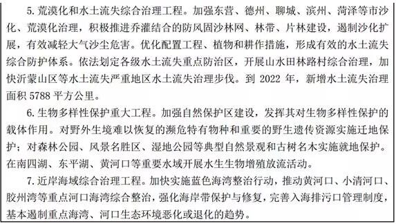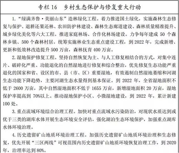 (二)實施生態(tài)修復重大工程。實施濕地修復工程,對集中連片、破碎化嚴重、功能退化的自然濕地進行修復和綜合整治,有效遏制自然濕地萎縮和河湖生態(tài)功能下降趨勢。開展沙化荒漠化治理,以東營、德州、聊城、濱州、菏澤五市為重點,積極推進喬灌結合的防風固沙林網(wǎng)、林帶、片林建設。推進荒山、荒溝、荒灘整治修復。積極推進泰山山水林田湖生態(tài)修復國家試點工程。支持長島海洋生態(tài)保護和持續(xù)發(fā)展。支持資源型城市開展生態(tài)修復工作,實施礦山環(huán)境治理恢復,持續(xù)推進采煤塌陷地治理。強化農(nóng)業(yè)防災減災能力建設,提高抵御洪澇災害、氣象災害等應急處置水平。