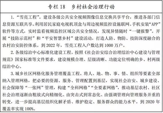 (三)全面推進平安智慧鄉(xiāng)村建設。加強治安突出問題排查整治,深入開展掃黑除惡專項斗爭,嚴厲打擊農(nóng)村黑惡勢力、宗族惡勢力,嚴厲打擊黃賭毒盜拐騙等違法犯罪。依法加大對農(nóng)村非法宗教活動和境外滲透活動打擊力度,依法制止利用宗教干預農(nóng)村公共事務。借鑒推廣浙江“楓橋經(jīng)驗”,創(chuàng)新群眾工作方法,健全完善村居、社區(qū)人民調(diào)解組織網(wǎng)絡,全面推行智慧民調(diào)系統(tǒng),善于運用法治思維和法治方式解決涉及群眾切身利益的矛盾和問題。落實社區(qū)服刑人員、刑滿釋放人員管理制度,健全政府主導、社會參與、家庭扶持的幫扶機制,使其盡快融入社會,預防重新違法犯罪。加強反邪教、社區(qū)戒毒、嚴重精神障礙患者服務管理工作,對鄉(xiāng)村留守老人、婦女兒童等強化服務教育,提高其自我防范意識和能力。強化網(wǎng)格化管理,深入實施“雪亮工程”,繼續(xù)深化平安智慧村莊(社區(qū))創(chuàng)建活動,構建人防、技防、物防深度融合的農(nóng)村治安防控體系。強化鄉(xiāng)村安全生產(chǎn)監(jiān)管,防范各類事故發(fā)生。