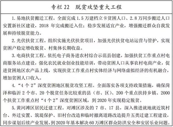 (二)聚焦深度貧困地區(qū)集中發(fā)力。加大對臨沂和菏澤2個市、20個脫貧任務比較重的縣(市、區(qū))、200個重點扶持鄉(xiāng)鎮(zhèn)、2000個省扶貧工作重點村和黃河灘區(qū)等深度貧困地區(qū)的支持力度。以解決突出制約問題為重點,以重大扶貧工程和到村到戶幫扶為抓手,新增脫貧攻堅資金、新增脫貧攻堅項目、新增脫貧攻堅舉措主要用于深度貧困地區(qū),著力改善發(fā)展條件,增強貧困群眾發(fā)展能力,攻克深度貧困堡壘。加快推進易地扶貧搬遷,統(tǒng)籌推進黃河灘區(qū)居民遷建工程建設,推動居民安置、產(chǎn)業(yè)培育同步規(guī)劃、同步實施,加強后續(xù)產(chǎn)業(yè)發(fā)展和轉移就業(yè),既讓群眾“挪窮窩”,也幫助其“撥窮根”,2018年全面完成易地扶貧搬遷任務,2020年基本解決60萬灘區(qū)居民防洪安全和安居樂業(yè)問題。