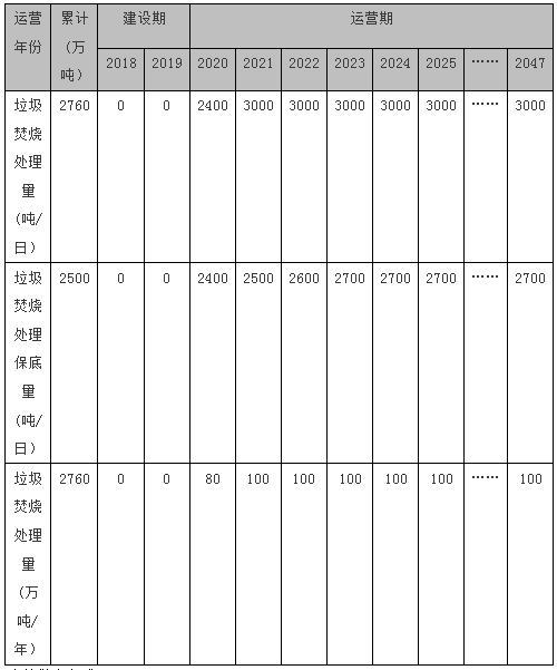 生活垃圾處理量運(yùn)營期第一年為2400噸/日,以后年份均為3000噸/日處理量,年有效運(yùn)行時(shí)間8000小時(shí),處理量測算見下表: