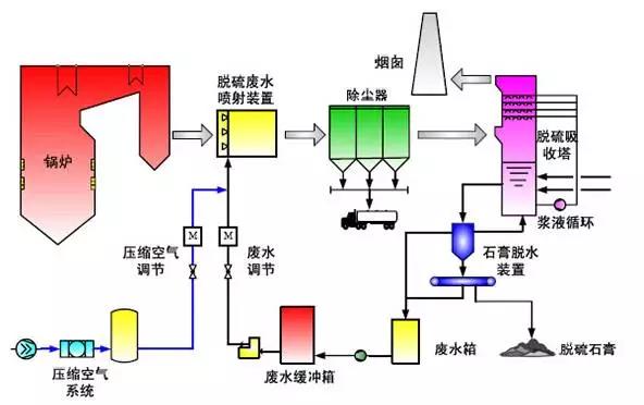將末端廢水霧化后噴入除塵器入口前煙道內(nèi),利用煙氣余熱將霧化后的廢水蒸發(fā);也可以引出部分煙氣到噴霧干燥器中,利用煙氣的熱量對末端廢水進(jìn)行蒸發(fā)。在煙道霧化蒸發(fā)處理工藝中,霧化后的廢水蒸發(fā)后以水蒸氣的形式進(jìn)入進(jìn)入脫硫吸收塔內(nèi),冷凝后形成純凈的蒸餾水,進(jìn)入脫硫系統(tǒng)循環(huán)利用。同時,末端廢水中的溶解性鹽在廢水蒸發(fā)過程中結(jié)晶析出,并隨煙氣中的灰一起在除塵器中被捕集。