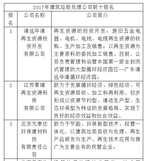 根據(jù)《中國報告大廳網(wǎng)》匯總信息得知,截至2017年底,通過對建筑垃圾處理行業(yè)各項數(shù)據(jù)統(tǒng)計,建筑垃圾處理公司排名前十的分別是清遠華清、江蘇黃埔、元泰達、天實偉創(chuàng)、上海山美、德濱環(huán)保、鼎盛工程、凱興礦山、一帆機械、黎明重工,詳細情況介紹如下: