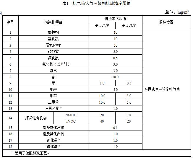 4.2.1電子工業(yè)生產(chǎn)過(guò)程中,設(shè)備或車(chē)間排氣筒排放大氣污染物濃度執(zhí)行表1規(guī)定的限值。