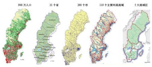 2000年,《歐盟水框架指令》開始實施,歐盟各成員國的水資源管理工作的開展更協調、更統(tǒng)一。自2004年起,為了更有效地管理水環(huán)境,瑞典被劃分為五大水資源區(qū)(如圖1、2所示),每個區(qū)包含多個江河流域。瑞典總共有119個主要的江河流域,這些流域是地方水資源管理工作的起點。這五大水資源區(qū)是按照它們與海床的地理區(qū)域關系劃分的,這些海床包括:波的尼亞灣區(qū)、波的尼亞海區(qū)、北波羅的海區(qū)、南波羅的海區(qū)、斯卡格拉克與卡特加特海峽區(qū)等。此后瑞典在五大水資源區(qū)開展水資源管理工作。