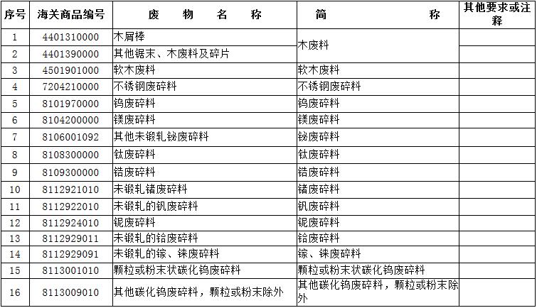 二、將不銹鋼廢碎料、鈦廢碎料、木廢碎料等16個品種固體廢物(見附件2),從《限制進(jìn)口類可用作原料的固體廢物目錄》《非限制進(jìn)口類可用作原料的固體廢物目錄》調(diào)入《禁止進(jìn)口固體廢物目錄》,自2019年12月31日起執(zhí)行。