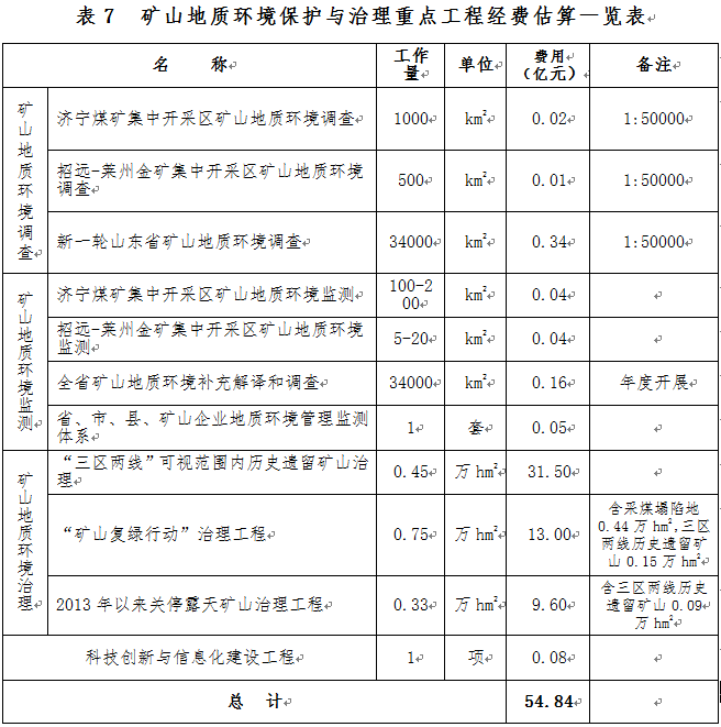 在濟(jì)寧煤礦集中開(kāi)采區(qū)、招遠(yuǎn)-萊州金礦集中開(kāi)采區(qū)開(kāi)展礦山地質(zhì)環(huán)境專(zhuān)項(xiàng)調(diào)查,在全省開(kāi)展新一輪礦山地質(zhì)環(huán)境詳細(xì)調(diào)查。調(diào)查費(fèi)用估算為0.37億元。