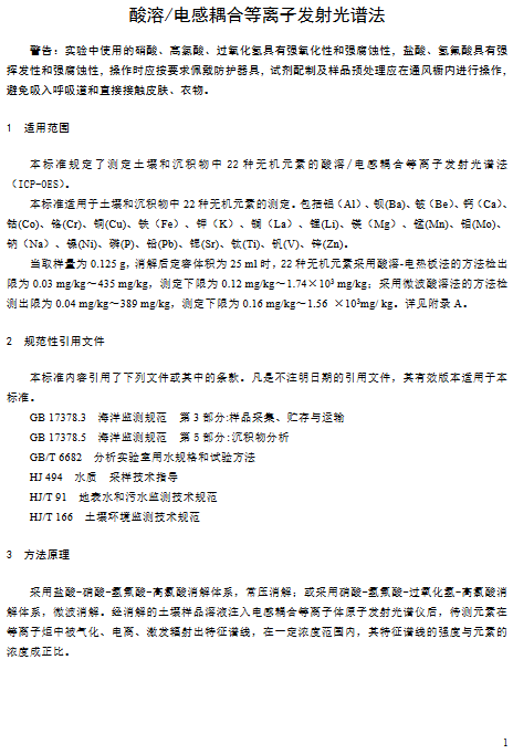 土壤和沉積物 22種無機(jī)元素的測定 酸溶/電感耦合等離子發(fā)射光譜法(征求意見稿)
