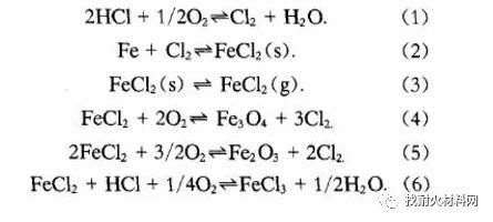 垃圾中塑料、橡膠和廚房廢料中都含有氯元素,例如聚氯乙烯廢物、聚偏二氯乙烯廢物、氯化丁基橡膠廢物、氯化鈉、氯化鉀等,這些有機(jī)和無(wú)機(jī)氯化物在高溫焚燒后都會(huì)產(chǎn)生HCl。垃圾焚燒廢氣中的氧的質(zhì)量分?jǐn)?shù)為5%?10%,而HCl的質(zhì)量濃度為800?4000mg/m3。高溫HCl的腐蝕機(jī)理目前報(bào)道較多的是活化氧化的機(jī)理,可見以下化學(xué)反應(yīng)式: