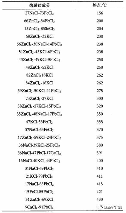 在破壞金屬氧化膜的同時(shí),還釋放出Cl2,進(jìn)一步發(fā)生氣相腐蝕金屬。此外,熔融鹽含有多種混合氯化物,比如堿金屬和重金屬氯化物共混時(shí),它們的共熔點(diǎn)變低,高溫環(huán)境下,熔融鹽成液相,這種液相腐蝕反應(yīng)使熔融鹽腐蝕進(jìn)一步加快,因?yàn)橐合嗷瘜W(xué)反應(yīng)往往比固相反應(yīng)快,其次,液相下會(huì)產(chǎn)生電解質(zhì)發(fā)生電化學(xué)腐蝕。表1列出了部分混合熔融鹽的共熔點(diǎn)。