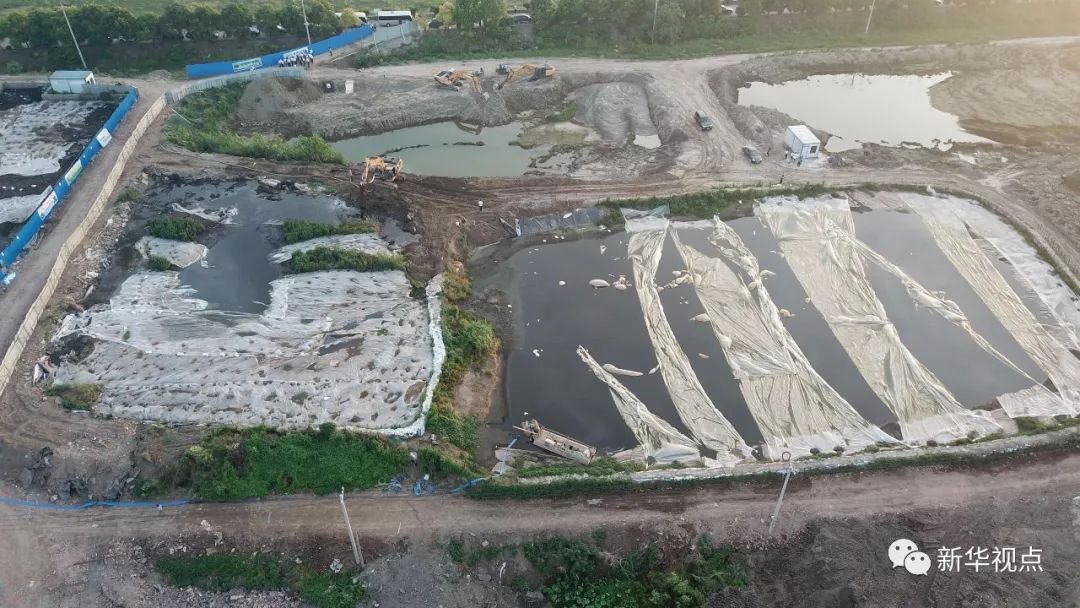 此外,泰興化工園區(qū)填埋化工廢料的地點距離污泥堆放點不到3公里。記者在現(xiàn)場看到,這一填埋點西臨長江堤岸不到50米,污染地塊已加裝綠色保護網(wǎng)和防塵隔離欄,有兩臺挖掘機正在開挖排水明溝。