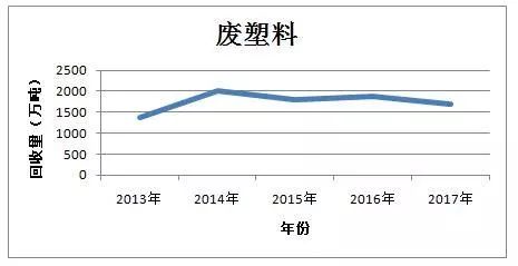 2017年國內(nèi)廢塑料回收量為1693萬噸,較2016年下降了185萬噸,降幅為9.9%。但得益于廢塑料市場供不應(yīng)求現(xiàn)狀,尤其是洋垃圾禁令的發(fā)布,廢塑料價格持續(xù)走高,國內(nèi)廢塑料回收總值1081億元,較2016年增加12.9%增幅。