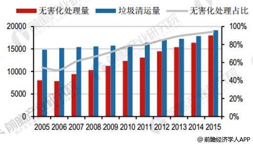 截至2015年底,全國城市范圍內(nèi)生活垃圾焚燒占比已達37.97%,其余城市生活垃圾以衛(wèi)生填埋或其它形式進行無害化處理。2005年至2015年的十年間,我國生活垃圾清運量及無害化處理率不斷提高,焚燒占無害化處理的比重增長超過3倍。