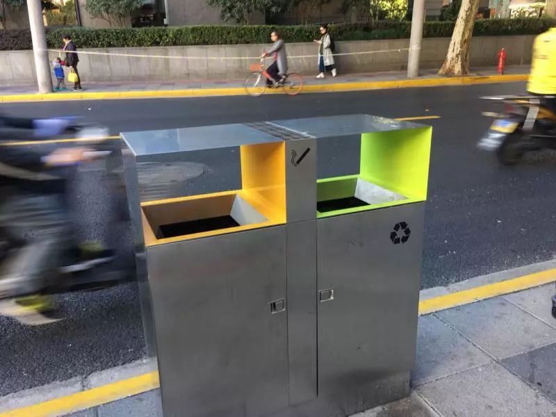 另一種,是這樣的一個(gè)垃圾箱被分成“可回收”“不可回收”兩個(gè)垃圾桶