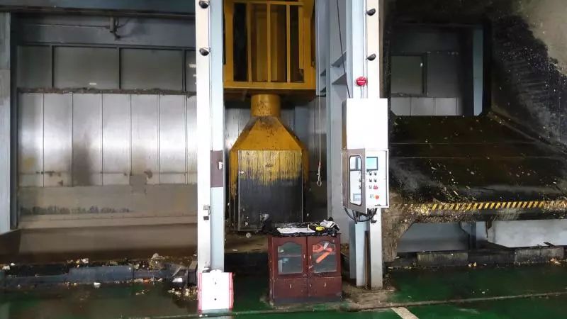 ⑧圖中的黃色重錘可向下一次次施力,將垃圾壓入下方的集裝箱內(nèi)