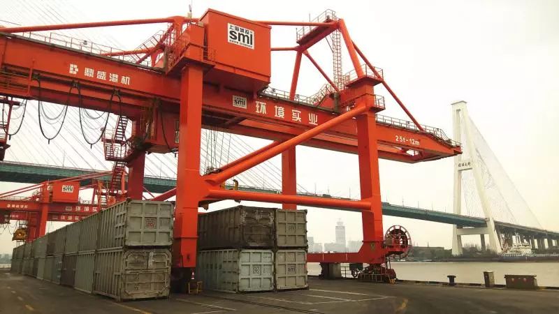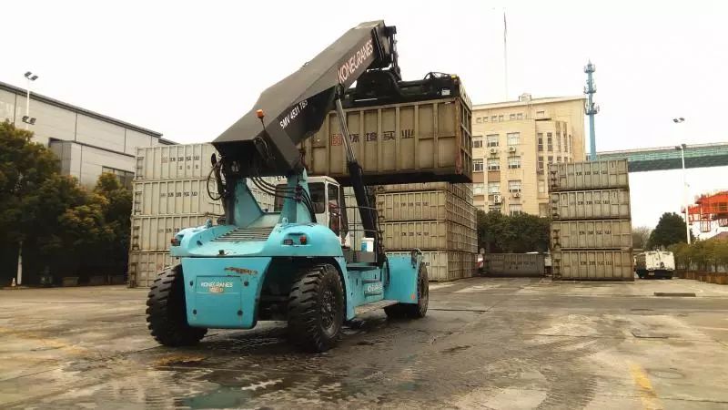 ⑩靈活的舉臂車(chē)可以鉗住垃圾集裝箱,將它們?cè)诖a頭邊堆疊起來(lái),方便吊車(chē)運(yùn)至集運(yùn)船上