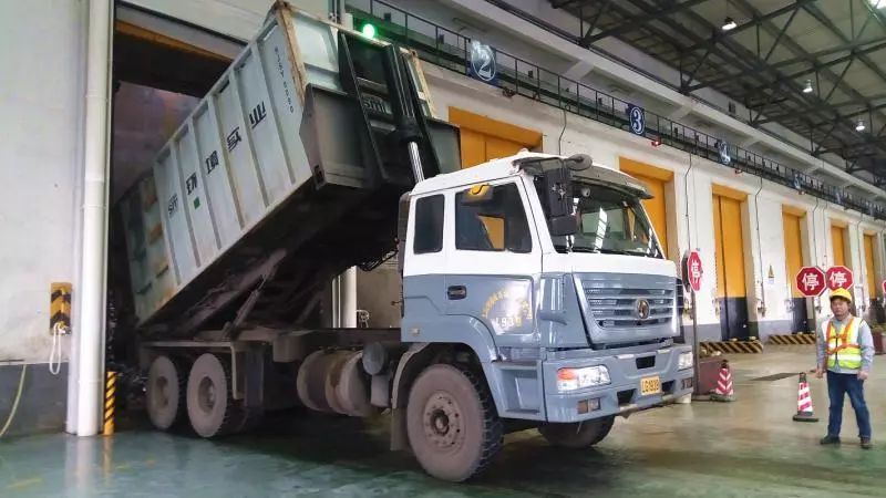 ⑦一路顛簸后,干垃圾車(chē)來(lái)到生活固廢集裝轉(zhuǎn)運(yùn)徐浦基地,將垃圾倒入“打包槽”