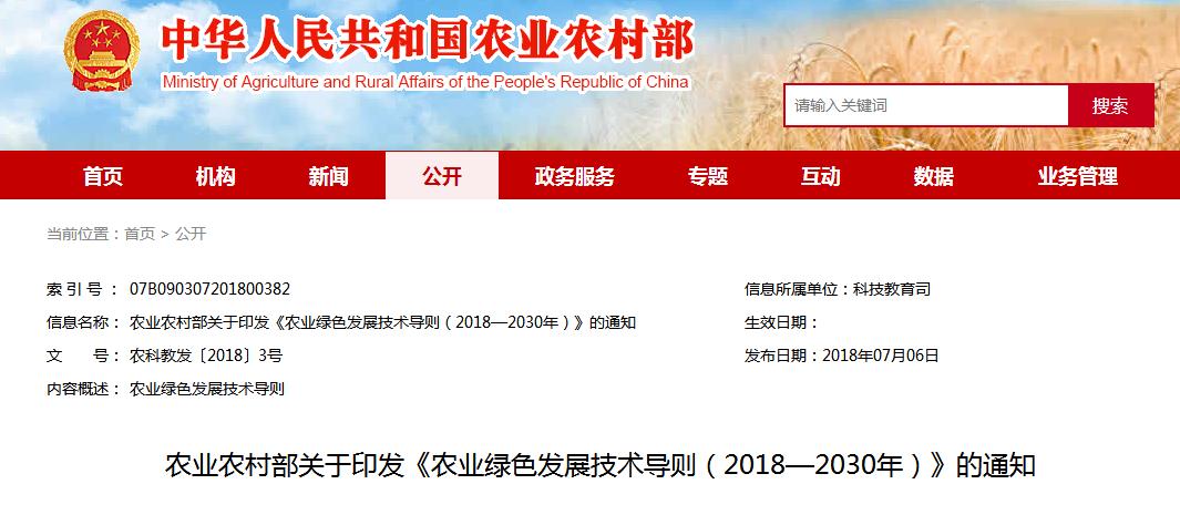 日前中華人民共和國農(nóng)業(yè)農(nóng)村部公布關(guān)于印發(fā)《農(nóng)業(yè)綠色發(fā)展技術(shù)導(dǎo)則(2018—2030年)》的通知,內(nèi)容如下: