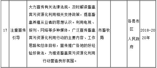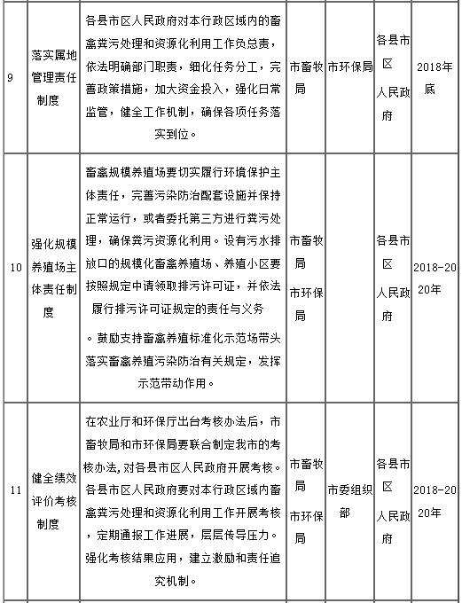 (三)落實屬地管理責(zé)任制度。各縣市區(qū)人民政府對本行政區(qū)域內(nèi)的畜禽糞污處理和資源化利用工作負(fù)總責(zé),在工作推進(jìn)中,依法明確部門職責(zé),細(xì)化任務(wù)分工,完善政策措施,加大資金投入,強化日常監(jiān)管,健全工作機制,確保各項任務(wù)落實到位。各縣市區(qū)人民政府要按照本方案的主要目標(biāo)要求,確定分年度重點任務(wù),列出工作清單,于2018年7月底前抄送市畜牧局備案。(市畜牧局牽頭,市環(huán)保局參與)