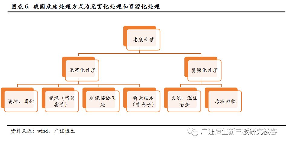 從具體的處理技術(shù)來看,危廢的處理方式與一般固廢大同小異,資源化的主要方法是干法及濕法,無害化的主要是填埋、焚燒等,部分危廢也會資源化處置之后再進行無害化的處理。
