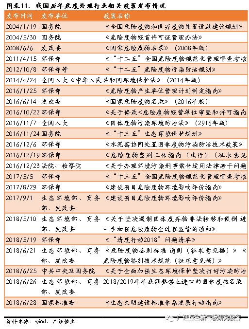 一是環(huán)保執(zhí)法力度加嚴(yán)。立法層面:根據(jù)2016年12月“兩高”出臺的關(guān)于《關(guān)于辦理環(huán)境污染刑事案件適用法律若干問題的解釋》,涉及入刑的條款,在認(rèn)定為“嚴(yán)重污染環(huán)境”的18個行為中,9條與危廢直接相關(guān)。執(zhí)法層面:2016年開始的中央環(huán)保督查,處理環(huán)保案件近十萬起,立案處罰2.69萬起,問責(zé)1.7萬人,罰款12.64億元。2018年長江經(jīng)濟帶開始的“清廢2018”行動,有望在2019-2020年推廣至全國。