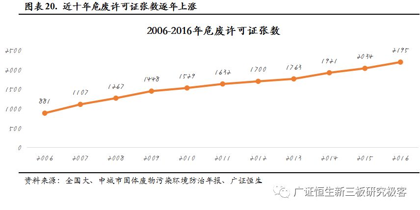 截止2016年底,我國各省市頒發(fā)的危廢許可證共2195份,相比2006年,數(shù)量增長149%, 2016年危廢僅增加161張。