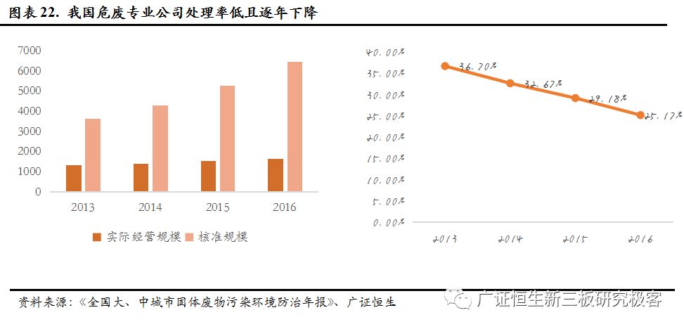 一是環(huán)保統(tǒng)計口徑的變化,可以看到,危廢產(chǎn)生量在2011年和2016兩次快速增長,2011年的增長是因為統(tǒng)計量從10kg下降到了1kg,2016年是擴大了危廢的種類,從400種擴大到了479種。