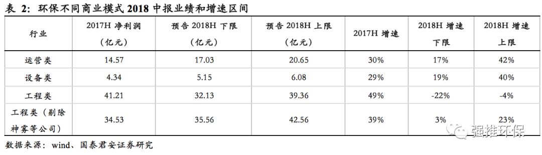 從細(xì)分子行業(yè)來看,危廢、煙氣治理、PPP、固廢、環(huán)境監(jiān)測、清潔能源、水處理、節(jié)能的增速區(qū)間分別為21%~42%、15%~40%、5%~33%、1%~33%、1%~27%、-1%~13%、-14%~3%、-140%~-137%??梢钥闯?,危廢板塊的增速下限已經(jīng)與2017年中報的增速持平,而以節(jié)能、清潔能源為主的細(xì)分板塊過去兩年帶領(lǐng)環(huán)保板塊增長的工程類模式增速出現(xiàn)了較大幅度的下滑,且PPP、水處理等細(xì)分板塊增速也有所放緩。