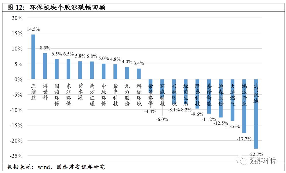 本周市場行情概覽:環(huán)保、燃?xì)?、水?wù)與電力板塊分別上漲1.15%、2.53%、0.50%與3.62%;其中環(huán)保板塊漲跌幅18/103;創(chuàng)業(yè)板指下跌0.55%,上證綜指下跌0.07%,深證成指下跌0.81%。漲幅前三名:三維絲(14.52%)、博世科(8.48%)、國禎環(huán)保(6.52%);漲幅后三名:*ST凱迪(-22.67%)、鴻達興業(yè)(-17.66%)、大通燃?xì)?-13.60%)。