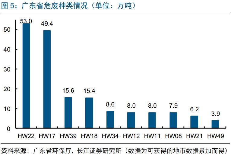 廣東省危廢種類中前5位的HW08(含油污泥,96.8萬噸,占總資質(zhì)的20%)/HW22(含銅廢物,76.7萬噸,占總資質(zhì)的15%)/HW17(表面處理污泥,56.3萬噸,占總資質(zhì)的11%)/HW49(其他廢物,50.2萬噸,占總資質(zhì)的10%)/HW48(有色金屬冶煉廢物,26.6萬噸,占總資質(zhì)的5%)合計(jì)占總資質(zhì)61%,危廢資質(zhì)種類集中度高。