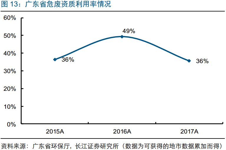 2015-2017年廣東省危廢資質(zhì)利用率分別為36%、49%、36%,廣州和深圳資質(zhì)利用率在40%-50%之間。