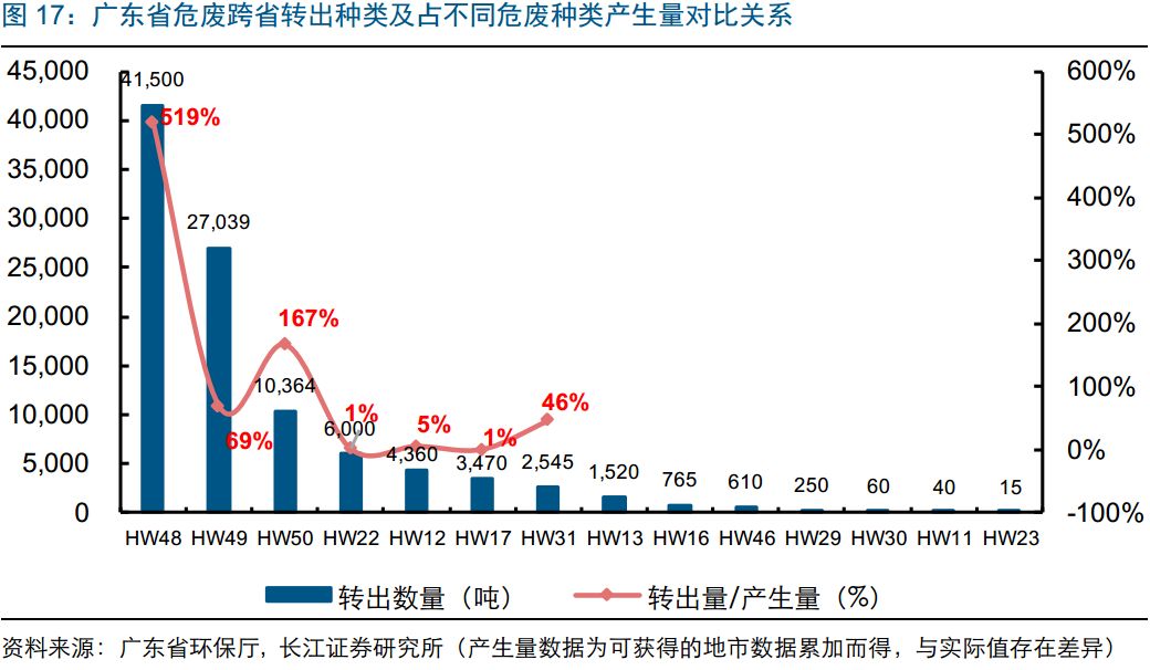 從2017年轉(zhuǎn)出危廢種類來看,HW48(有色金屬冶煉廢物)/49(其他廢物)/50(廢催化劑)/22(含銅廢物)/12(染料、涂料廢物)前五合計(jì)達(dá)8.9萬噸,占轉(zhuǎn)出量的90%。而從轉(zhuǎn)出量和產(chǎn)生量的比例來看,廣東省HW48(有色金屬冶煉廢物)、HW50(廢催化劑)、HW49(其他廢物)、HW31(含鉛廢物)對(duì)省外處理資質(zhì)依賴度高;HW22(含銅廢物)、HW17(表面處理廢物)、HW12(染料、涂料廢物)基本都在本省進(jìn)行處理。