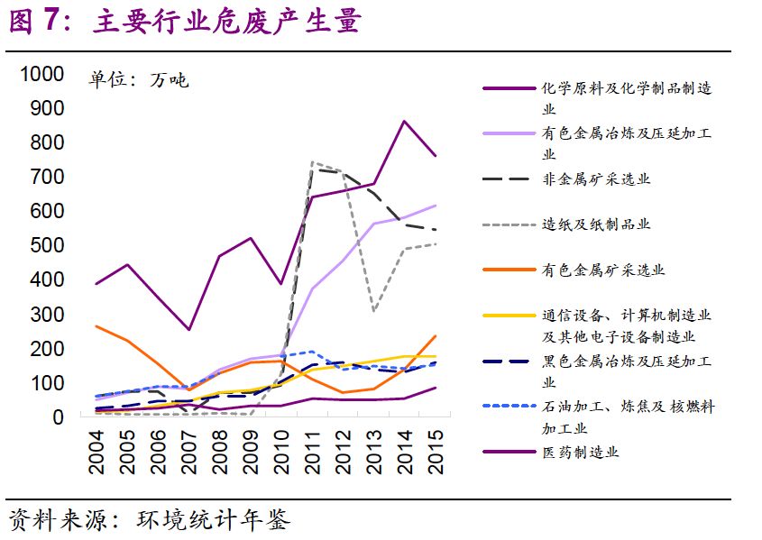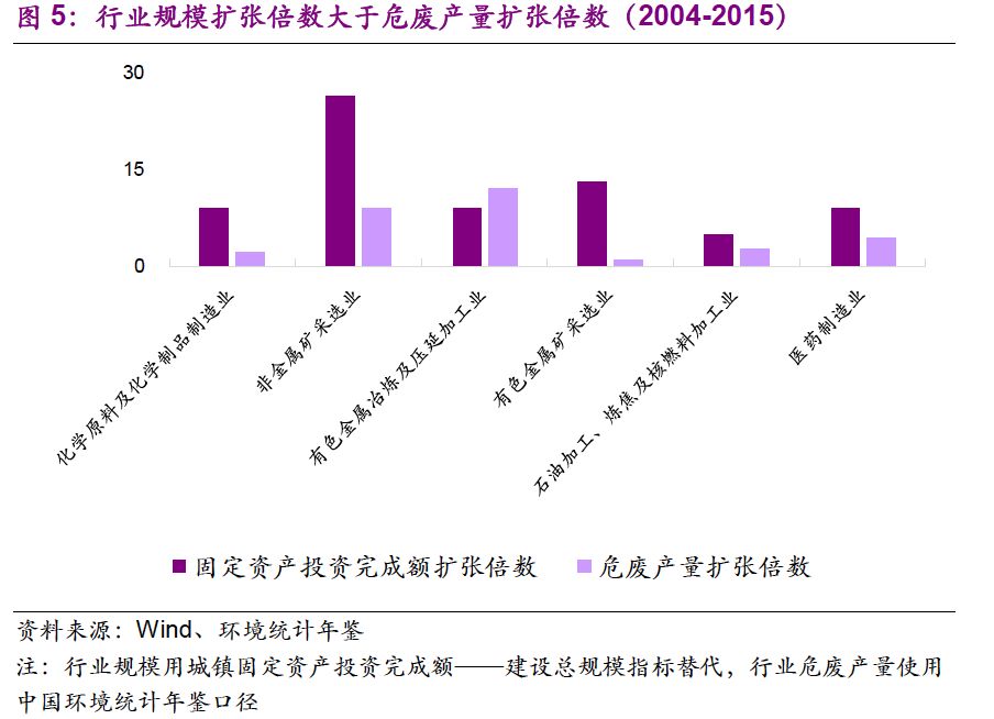 我們也關(guān)注到主要行業(yè)規(guī)模擴(kuò)張倍數(shù)大于危廢產(chǎn)量擴(kuò)張倍數(shù)。從2004年到2015年,化學(xué)原料及化學(xué)制品制造業(yè)、非金屬礦采選業(yè)、有色金屬冶煉及壓延加工業(yè)、有色金屬礦采選業(yè)、石油加工、煉焦及核燃料加工業(yè)、醫(yī)藥制造業(yè)的城鎮(zhèn)固定資產(chǎn)投資完成額——建設(shè)總規(guī)模分別是2004年的9 、26 、9 、13 、5 、9 倍,我國(guó)工業(yè)體系得到長(zhǎng)足發(fā)展。同期,各行業(yè)危廢產(chǎn)量分別是原來(lái)的2 、9 、12、1、3 、4 倍,總體小于建設(shè)總規(guī)模擴(kuò)張倍數(shù)。
