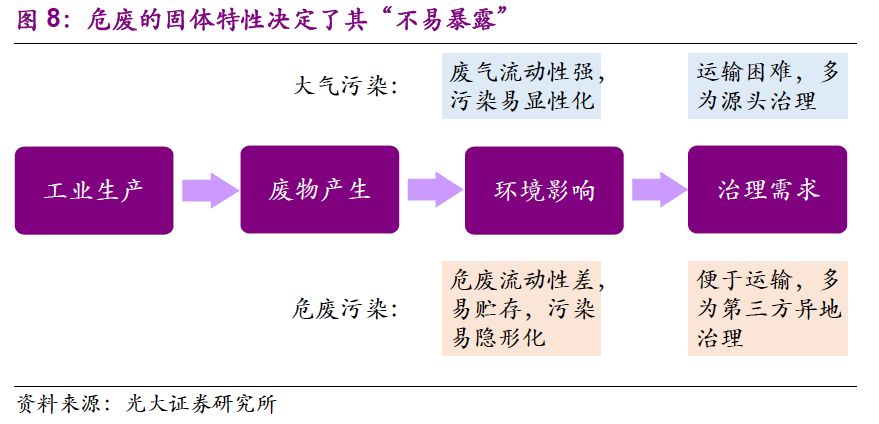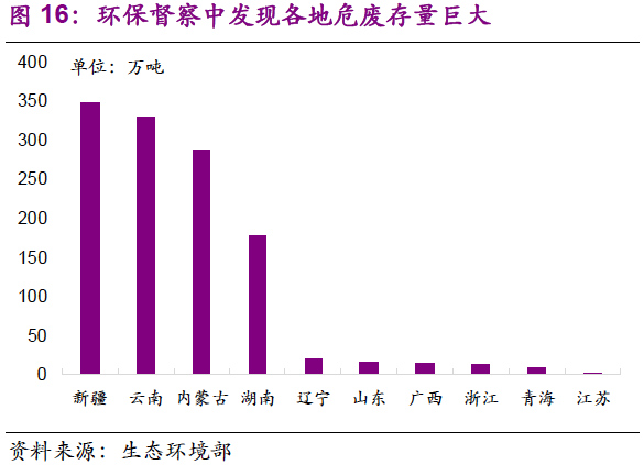 危廢的固體性質(zhì)決定了隱性需求釋放依賴環(huán)保執(zhí)法壓力。按照污染物性質(zhì),可分為廢氣、廢水、固廢三類。就環(huán)境影響來(lái)講,廢氣流動(dòng)性強(qiáng),污染顯性化,也是最早引起關(guān)注的。危廢多為固體,易于貯存和隱匿,污染呈隱性化。過(guò)去環(huán)保執(zhí)法壓力不足,大量危廢被就地掩埋或違規(guī)傾倒,造成了嚴(yán)重的環(huán)境影響。相比大氣治理,危廢污染的總量難以掌握,加上其治理費(fèi)用高昂,治理需求,尤其是存量的釋放較大程度上依賴環(huán)保執(zhí)法壓力。