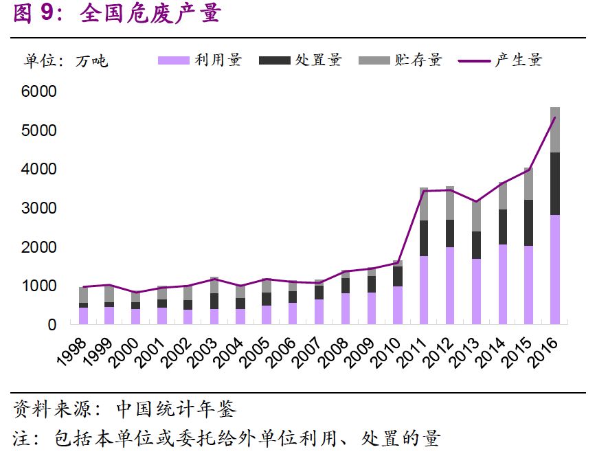 2011年統(tǒng)計(jì)口徑發(fā)生變化,當(dāng)年危廢產(chǎn)生量提升較快。當(dāng)年,我國(guó)改革危廢統(tǒng)計(jì)規(guī)則,將下限由10 kg降至1 kg,同年各個(gè)行業(yè)的危廢統(tǒng)計(jì)量均具有一定數(shù)量的增加。